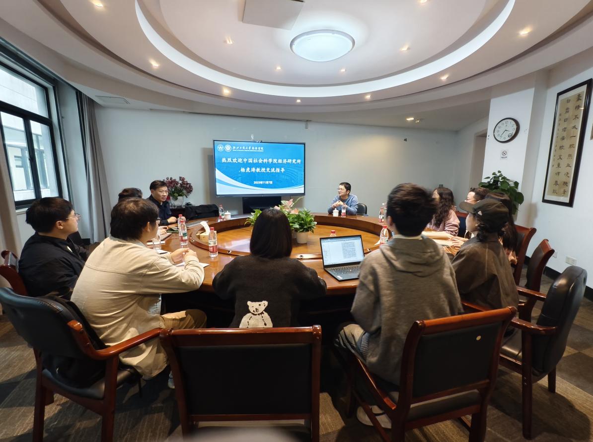 在学术汇报环节,浙江工商大学相关学者分享了最新研究成果。公共管理学院的刘兰剑教授介绍了国家社科基金重点项目《面向国家科技安全的竞争前关键技术特征识别与防御机制研究》的进展,提出“竞争前技术”新概念及弱信号识别方法,并分享了地方政府基础研究投入、科技创新与产业创新融合、教科一体化等方面的研究发现。管理工程与电子商务学院教授、教务处处长伍蓓教授结合浙江特色,汇报了《创新生态视角下科技领军企业主导的科技创新与产业创新深度融合多案例研究》,以宇树科技等多家“六小龙”企业为案例,探讨了“两新融合”的机制与实践路径。工商管理学院(MBA学院)教授、社会科学部部长王晓蓬教授团队的李玉文老师介绍了正在做的课题《绿色金融何以驱动绿色生产力:绿色创新视角》,讲述了如何将金融资源有效导向绿色发展、并转化为可持续生产力,是加快绿色生产力培育的路径。